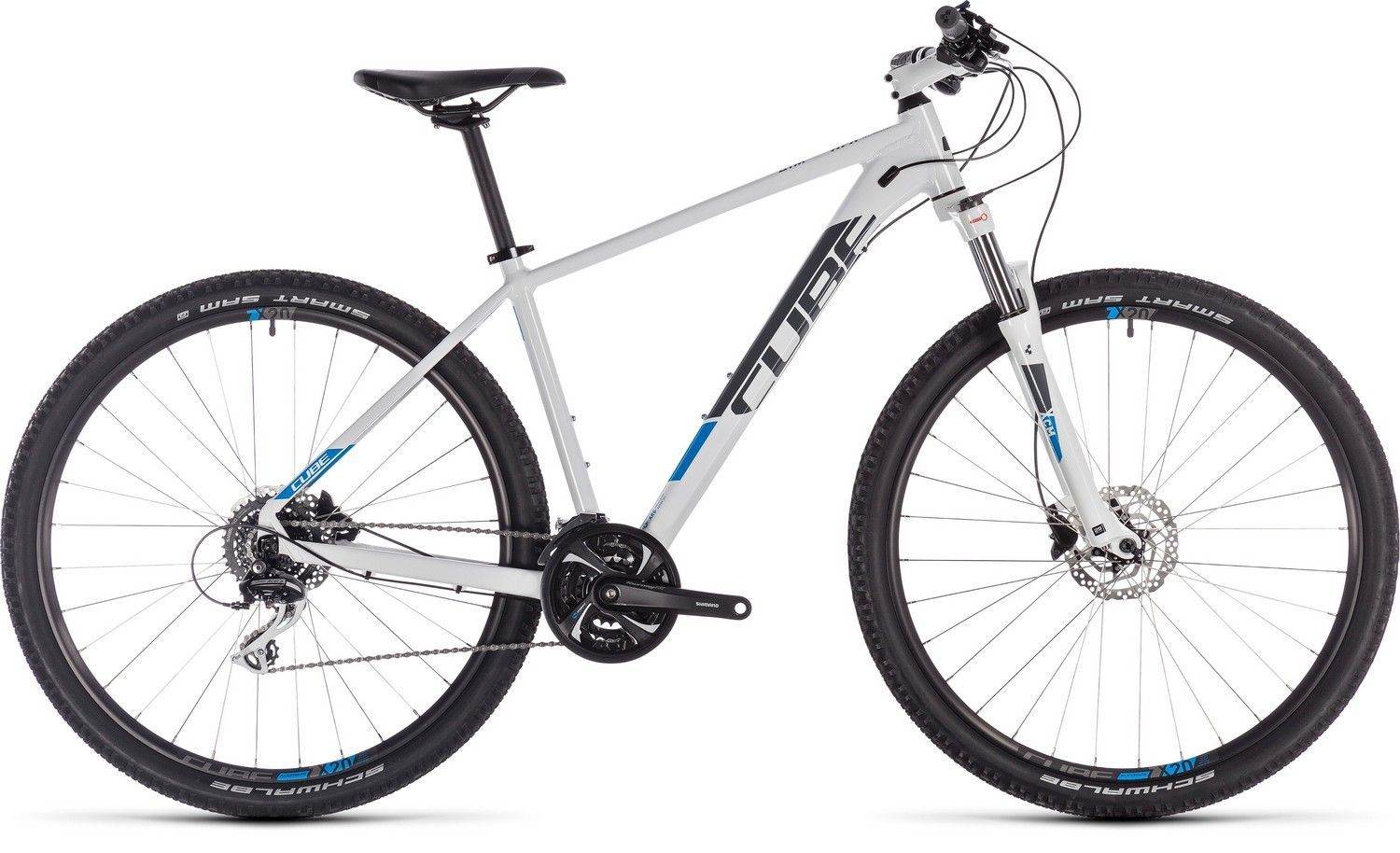 Покрышки Schwalbe Smart Sam обеспечивают отличное сцепление с различными типами покрытия как при движении по прямой, так и при маневрировании. Для безопасности в байке Cube AIM Race 27.5 (2019) предусмотрены дисковые гидравлические тормоза Shimano BR-MT200, отзывчивые и безотказные даже в сложных условиях.